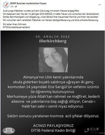 DİTİB Federal Kadın Birliği’den hayatını kaybeden Ece için taziye mesajı!..