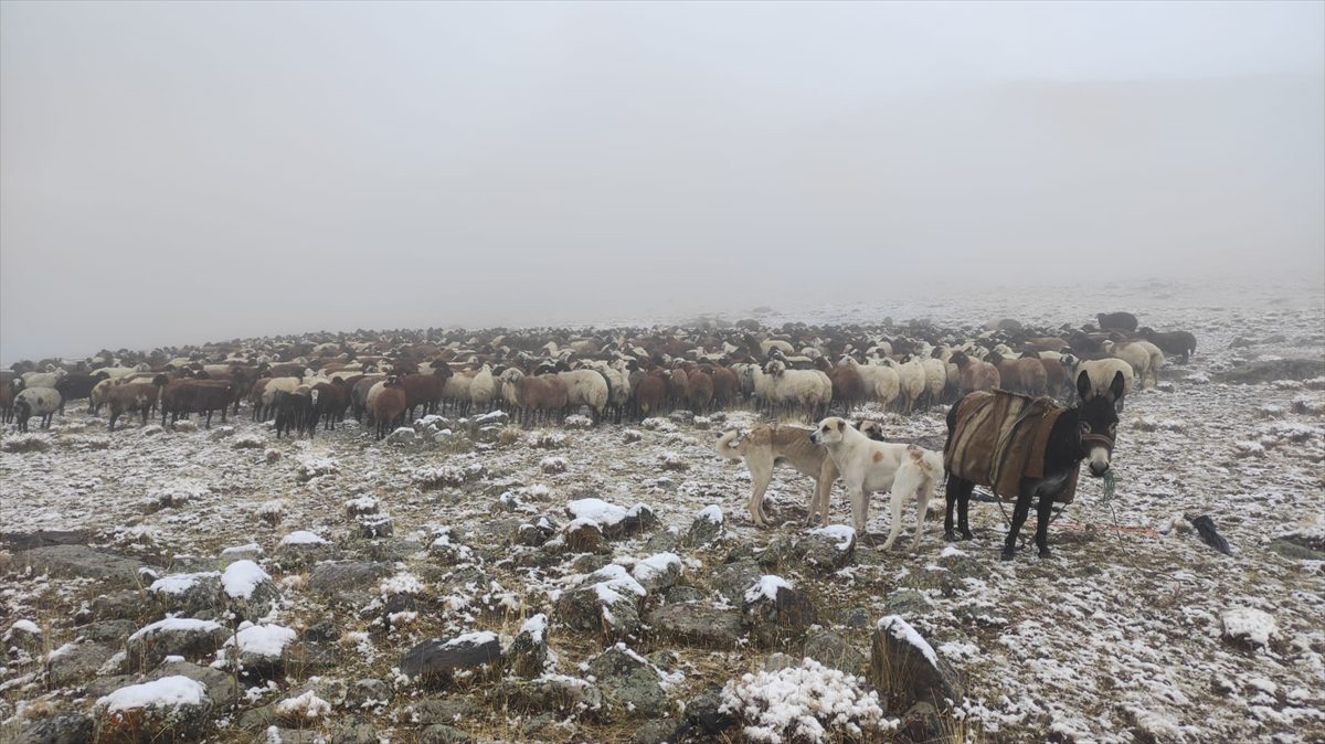 AĞRI (AA) – Ağrı'da, yüksek rakımlı bölgelerde etkili olan kar yağışı ve sis, binlerce küçükbaş hayvanı otlatan çobanlara zor anlar yaşatıyor.