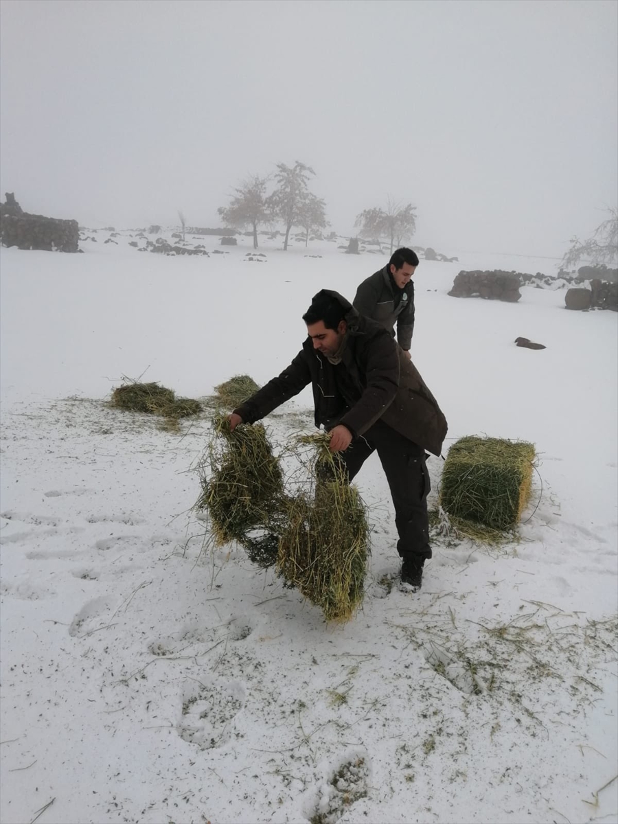 AĞRI (AA) – Ağrı'da bir araya gelen gönüllüler, yağışların ardından beyaza bürünen dağlarda yiyecek bulmakta güçlük çeken yaban hayvanları için doğaya yem bıraktı.