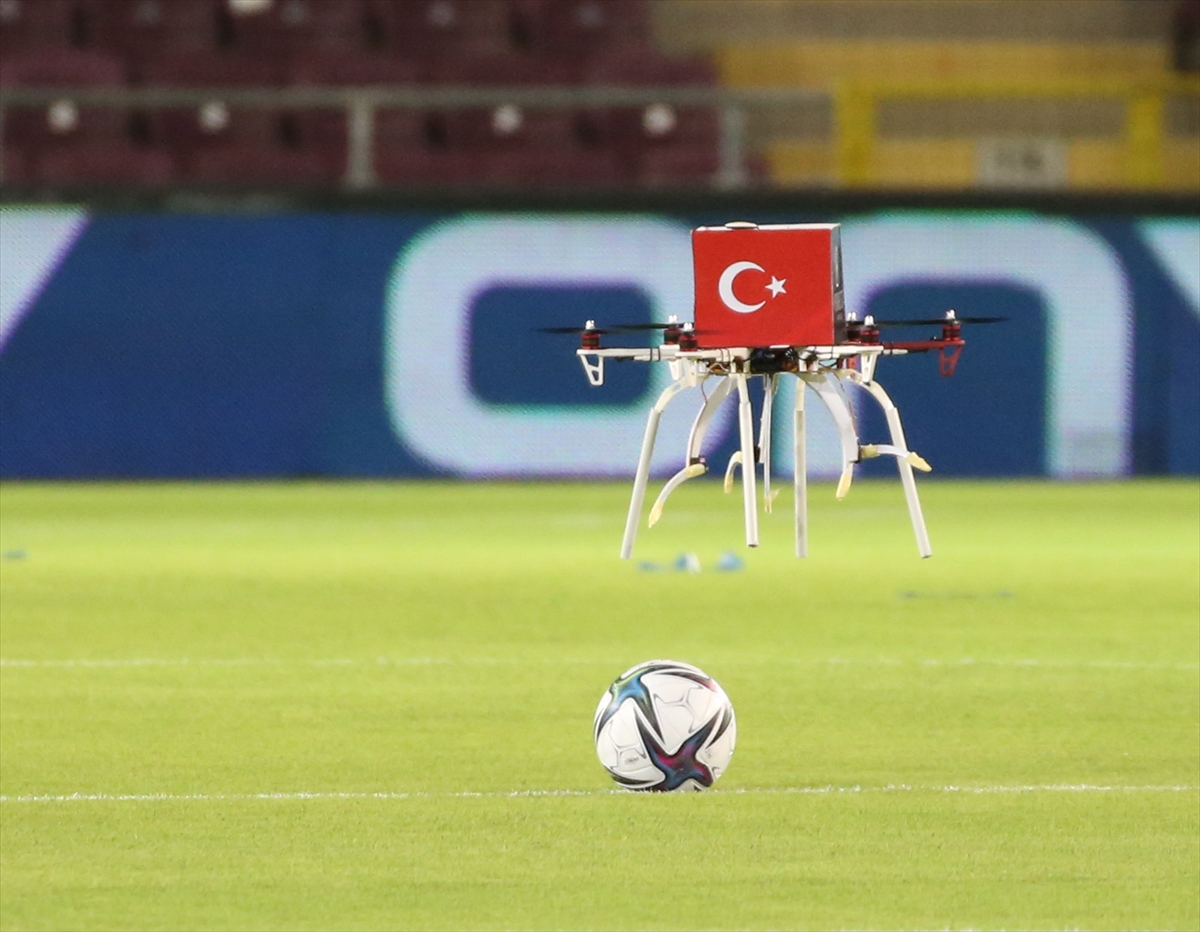 Drone pilotu Gürhan Ünses, maçın oynanacağı topu drone ile santra noktasına bıraktı.