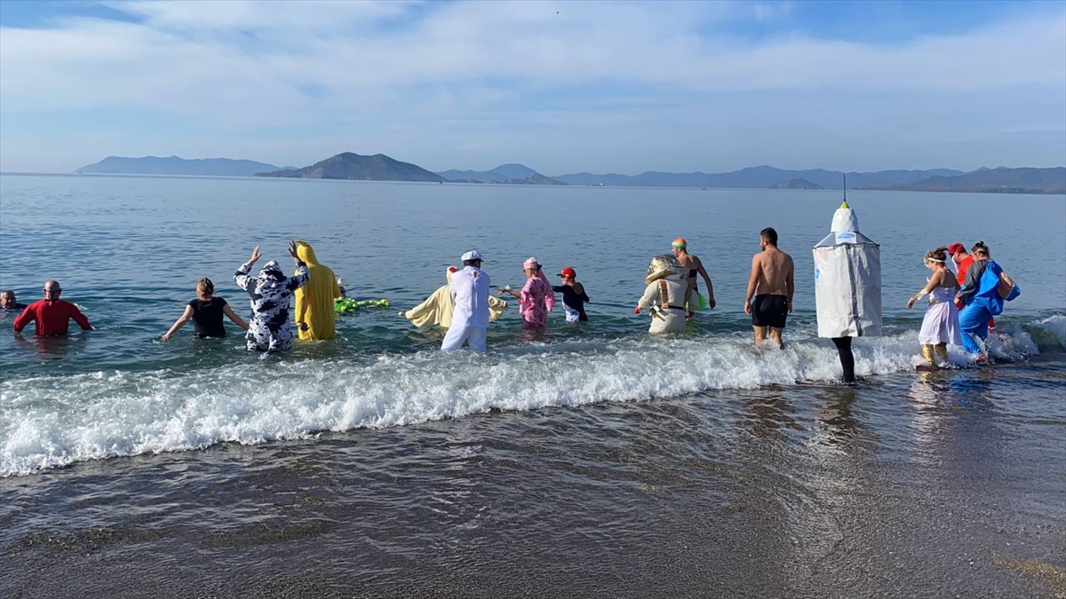 Fethiye'de bir grup yerleşik yabancı kostümlerle denize girdi