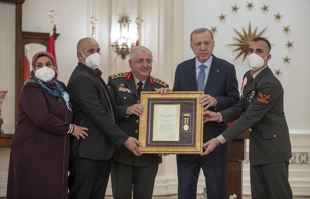 Erdoğan, törene katılan protokol üyeleriyle şehit yakınları, gaziler ve gazi yakınlarına madalya ve beratlarını takdim etti.