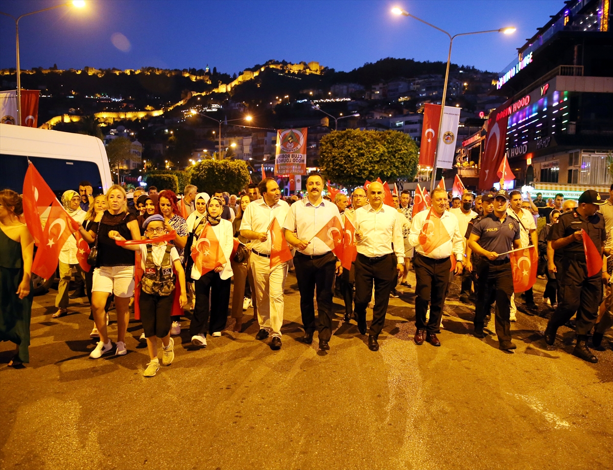 Antalya'nın Alanya ilçesinde 15 Temmuz Demokrasi ve Milli Birlik Günü dolayısıyla İskele Şelale önünden başlayan yürüyüş, Cumhuriyet Meydanı'ndaki Atatürk Anıtı'nda sona erdi.