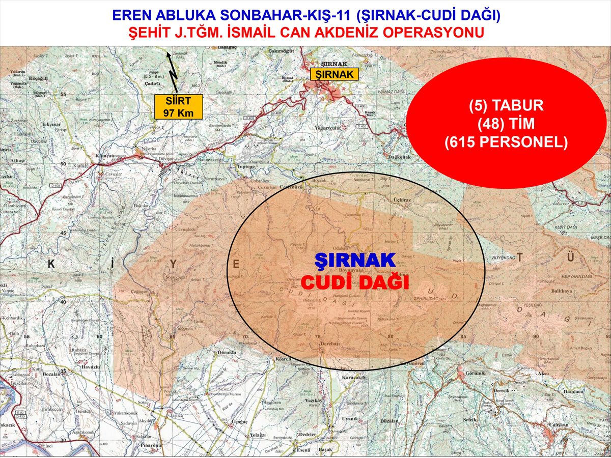 Şırnak Jandarma Bölge Komutanlığı koordinesinde, Şırnak Çakırsöğüt Jandarma Komando Tugay Komutanlığı sevk ve idaresinde gerçekleştirilen "Eren Abluka Sonbahar-Kış-11 Şehit Jandarma Teğmen İsmail Can Akdeniz Operasyonu"nda, Jandarma Özel Harekat (JÖH), Jandarma Komando ve Güvenlik Korucu timlerinden oluşan 615 personel 48 operasyonel tim görev alıyor.