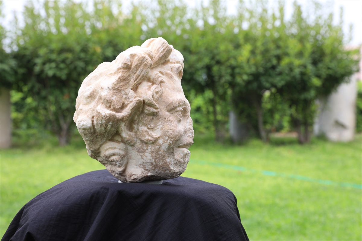 Smyrna Tiyatrosu'ndaki kazıda bulunan heykel başı koruma altında