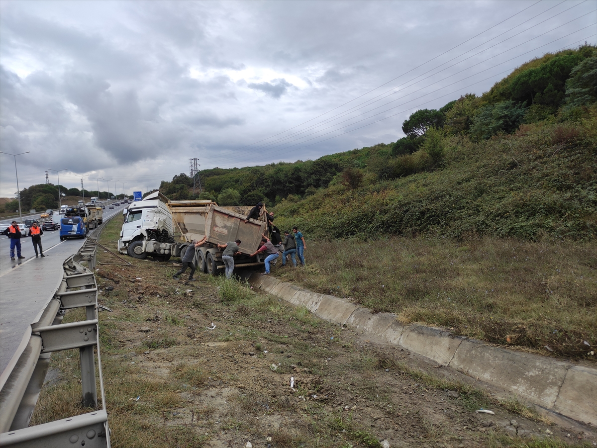 Eyüpsultan'da yoldan çıkan hafriyat kamyonu toprak alanda mahsur kaldı