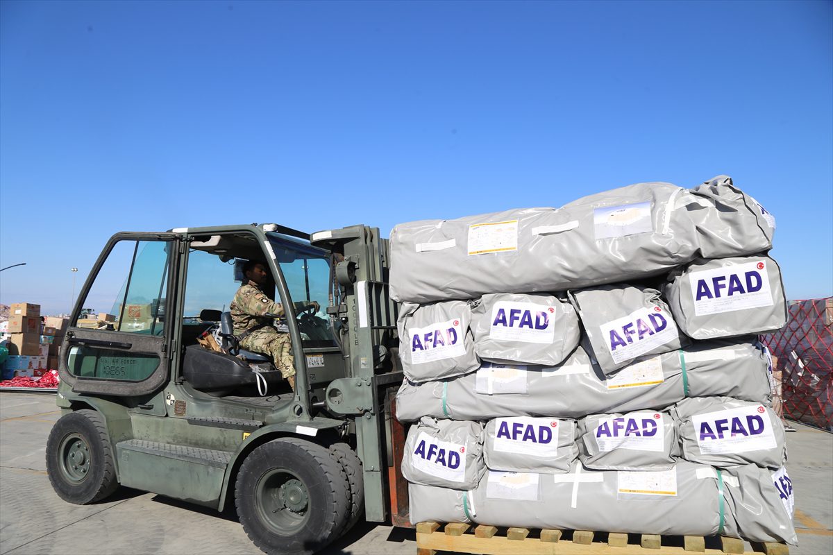 Çadır, battaniye, jeneratör ve ısıtıcılar ile gıda malzemelerinin olduğu paketler, İncirlik 10. Tanker Üs Komutanlığında oluşturulan "hava yardım koridoru" ile depremzedelere ulaştırılması için askeri uçak ve helikopterlere yükleniyor.