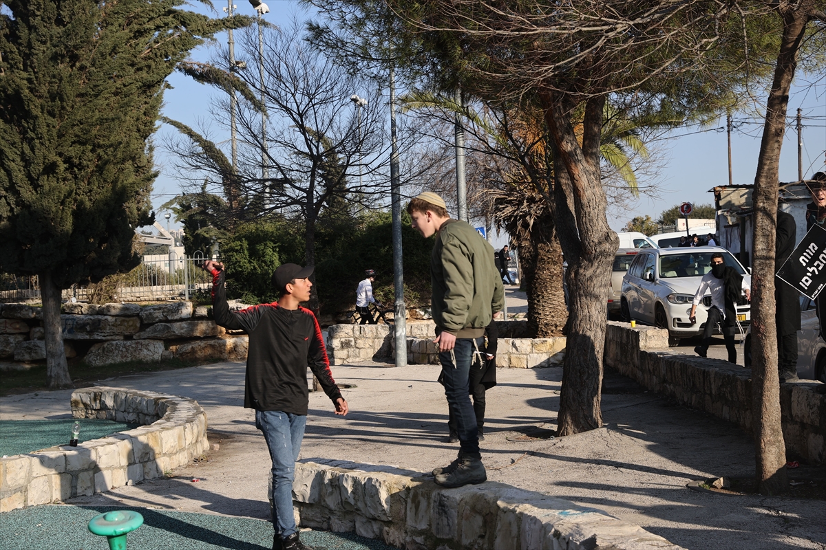 Yahudi yerleşimciler bölgedeki Filistinlilerle sözlü sataşmaya girerken, İsrail polisi Filistinlileri yerinden uzaklaştırmaya çalıştı.