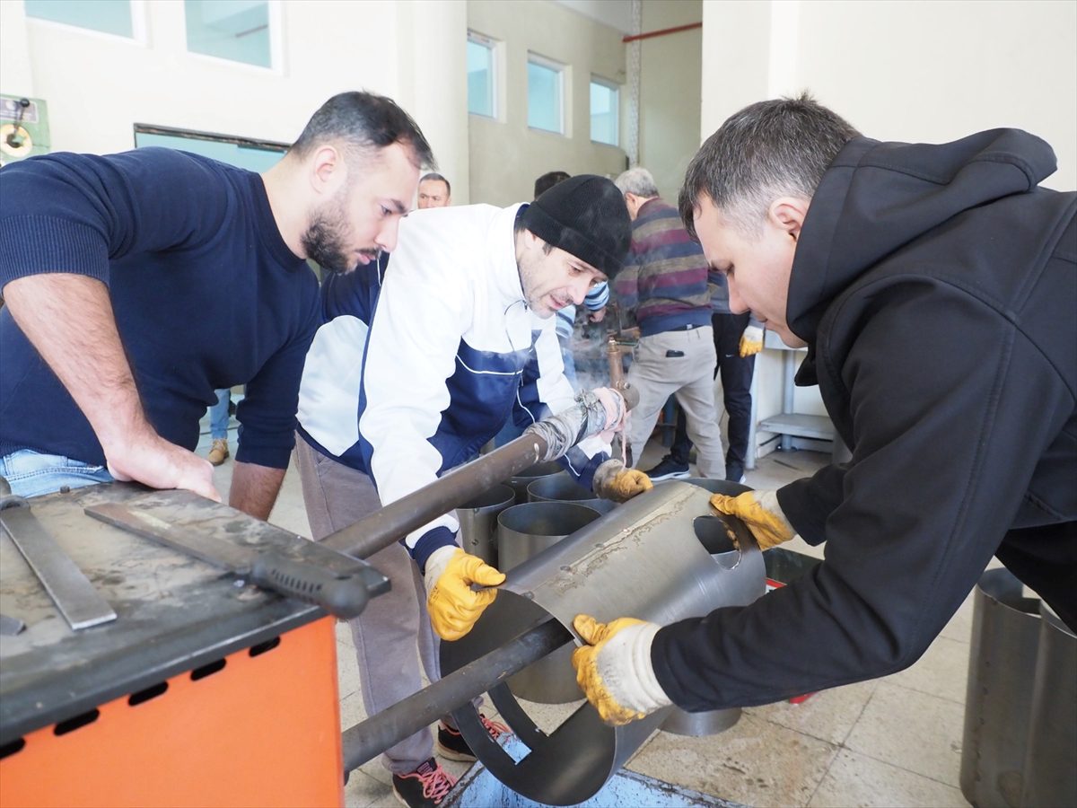 Kentte Nazilli Mesleki ve Teknik Anadolu Lisesi öğretmen ve öğrencileri de depremzedeler için soba üretiyor.