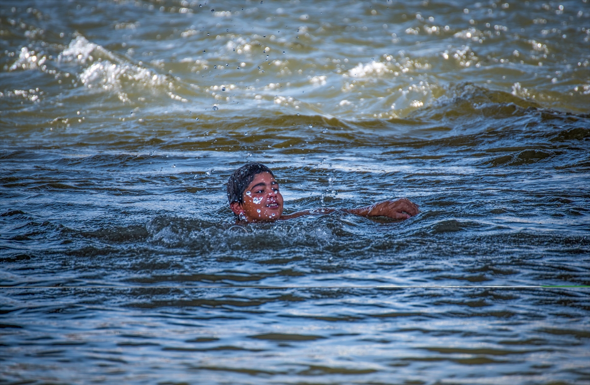 Sıcaktan bunalan çocuklar Kars Çayı'nda serinliyor