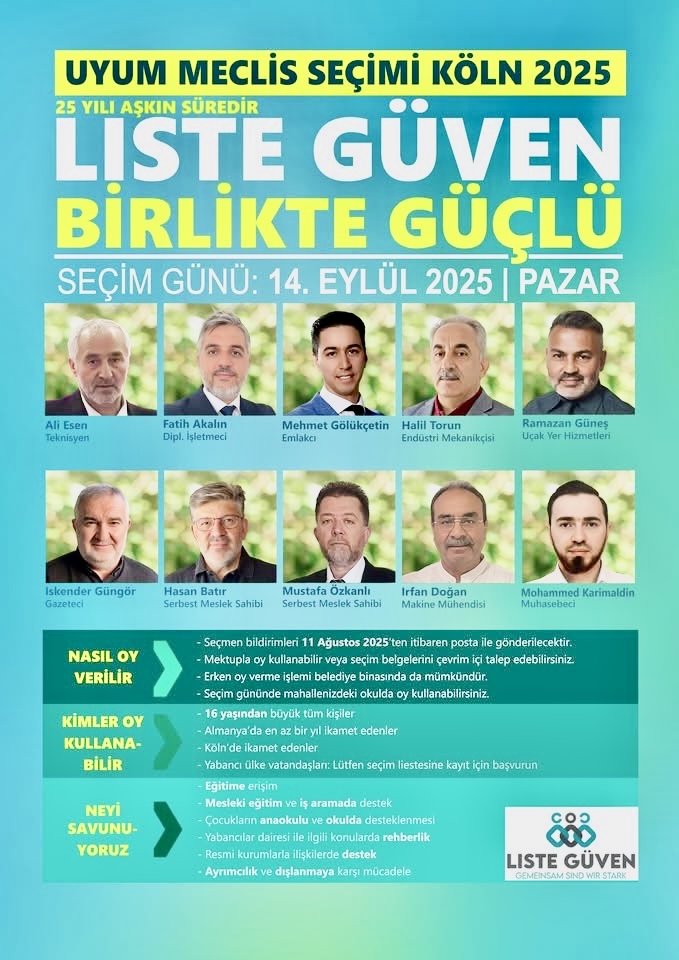 “Liste Güven” ekibi de bu seçimlerde yeniden aday olarak Kölnlü göçmenlerin sesi olmayı hedefliyor. Yaklaşık 25 yıldır Köln Belediye Binası’nda temsil sağlayan Liste Güven, yeni ekibiyle çalışmalarını sürdürmek istiyor.