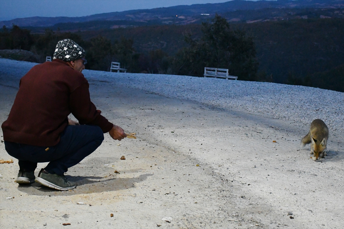 Manisa'da restoran sahibi, işletmesine gelen tilkileri elleriyle besliyor