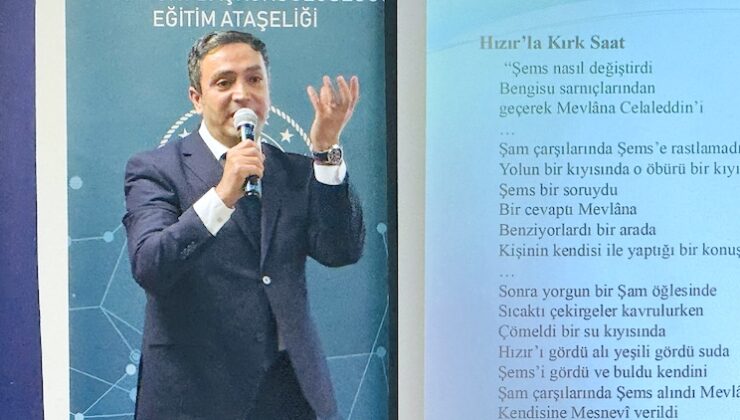 Türkçe ve Türk Kültürü öğretmeni Dr. Cafer Bidav, “Mevlânâ’nın Toplumsal ve Edebî Etkileri” başlıklı sunumunda, Mevlevîhanelerin yalnızca tasavvuf merkezleri değil; sanat, edebiyat ve düşünceyi besleyen çok yönlü eğitim kurumları olduğunu vurguladı.