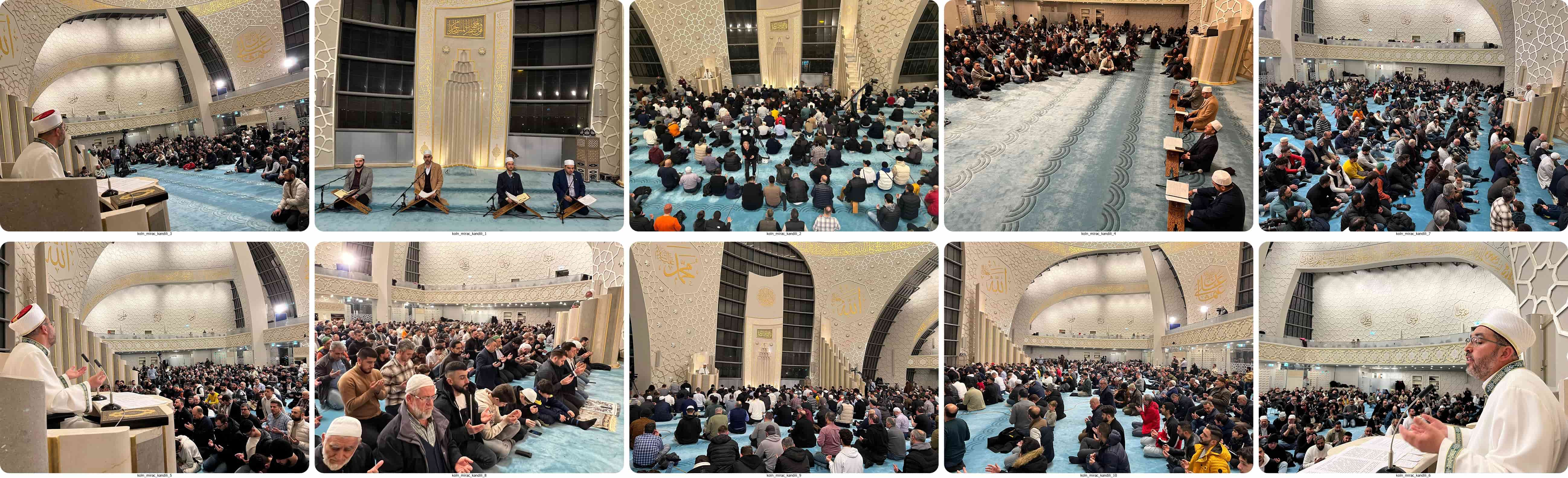 Köln DİTİB Merkez Camii’nde akşam namazının ardından gerçekleştirilen Miraç Kandili özel programında, din görevlileri Naci Şengün, Adem Kemaneci, Mustafa Kader ve Gökhan Uygun tarafından Kur’an-ı Kerim, ilahiler ve mevlid-i şerif okundu, dua edildi.