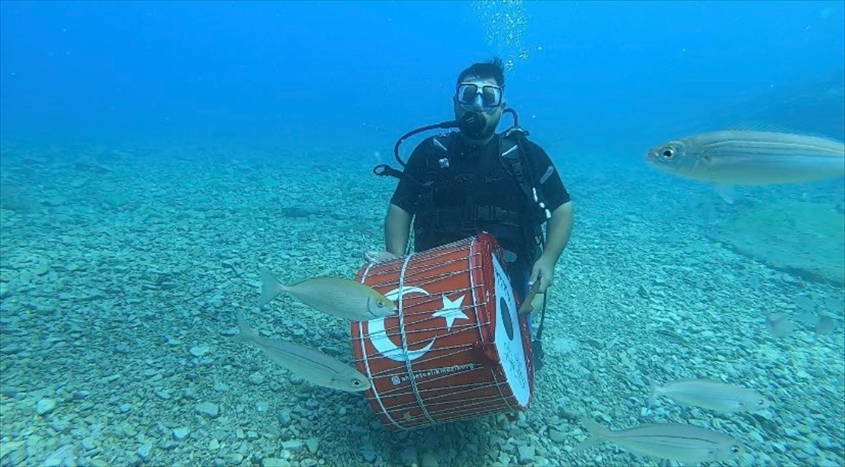 TEKİRDAĞ (AA) – Tekirdağ'da yaşayan Ahmet Çelik, Muğla'nın Fethiye ilçesinde yamaç paraşütüyle gökyüzünde ve denizde dalış yaparak su altında davul çaldı.