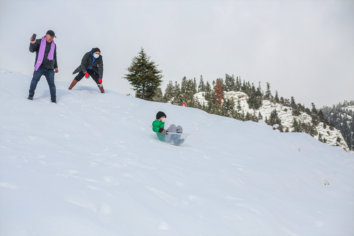 Antalya Akseki'de vatandaşlar, naylon ve leğenlerle kayak yaparak karın keyfini çıkardı