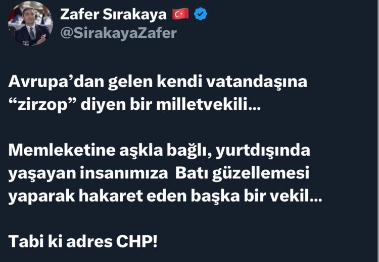 “Avrupa’dan gelen kendi vatandaşına ‘zirzop’ diyen bir milletvekili… Memleketine gönülden bağlı, yurt dışında yaşayan insanımıza Batı’yı överken hakaret eden başka bir vekil…