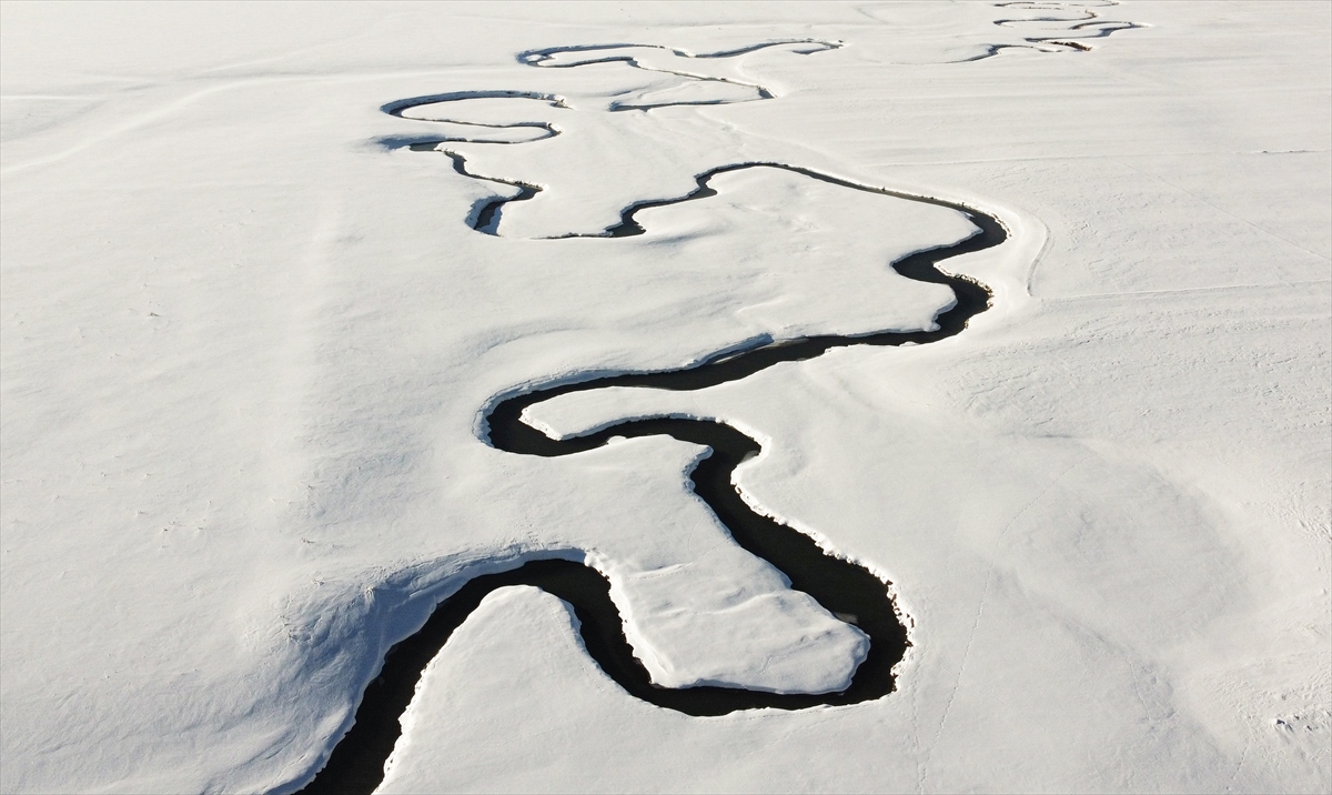 Özalp ilçesinde de Dorutay Mahallesi yakınlarındaki akarsuyun bembeyaz kar örtüsü arasında süzülen görüntüsü objektiflere yansıdı.